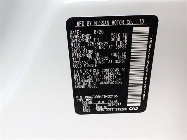 Check out this fantastic-looking 2026 INFINITI QX80 with the following amenities Black Interior Lighting Package (INFINITI Radiant Black Cargo Scuff Plates and Panoramic Illuminated Headliner), Sport Exterior Package (Black Roof Rail Crossbars and Dark Chrome Rear Bumper Protector), Apple CarPlay/Android Auto, Auto High-beam Headlights, Heads-Up Display, Heated front seats, Heated rear seats, Heated steering wheel, Memory seat, Navigation system: Google Built-in, Power Liftgate, Unique SPORT Semi-Aniline Leather Seating Surfaces, Ventilated front seats, Ventilated rear seats, Wheels: 22 x 8.5J Unique SPORT Alloy, 3rd row seats: bench, 4-Wheel Disc Brakes, ABS brakes, Adaptive suspension, Air Conditioning, Alloy wheels, AM/FM radio: SiriusXM with 360L, Anti-whiplash front head restraints, Audio memory, Auto tilt-away steering wheel, Auto-dimming door mirrors, Auto-dimming Rear-View mirror, Auto-leveling suspension, Automatic temperature control, Brake assist, Compass, Delay-off headlights, Driver door bin, Driver vanity mirror, Dual front impact airbags, Dual front side impact airbags, Electronic Stability Control, Emergency communication system: INFINITI InTouch, Four wheel independent suspension, Front anti-roll bar, Front Bucket Seats, Front Center Armrest, Front dual zone A/C, Front reading lights, Fully automatic headlights, Garage door transmitter: HomeLink, Genuine wood dashboard insert, Genuine wood door panel insert, Heated door mirrors, HVAC memory, Illuminated entry, Knee airbag, Leather steering wheel, Low tire pressure warning, Occupant sensing airbag, Outside temperature display, Overhead airbag, Overhead console, Panic alarm, Passenger door bin, Passenger vanity mirror, Power door mirrors, Power driver seat, Power moonroof, Power passenger seat, Power steering, Power windows, Radio data system, Rain sensing wipers, Rear air conditioning, Rear anti-roll bar, Rear reading lights, Rear seat center armrest, Rear window defroster, Rear window wiper, Reclining 3rd row seat, Remote keyless entry, Security system, Speed control, Speed-sensing steering, Split folding rear seat, Spoiler, Steering wheel memory, Steering wheel mounted audio controls, Tachometer, Telescoping steering wheel, Tilt steering wheel, Traction control, Trip computer, Turn signal indicator mirrors, and Variably intermittent wipers.