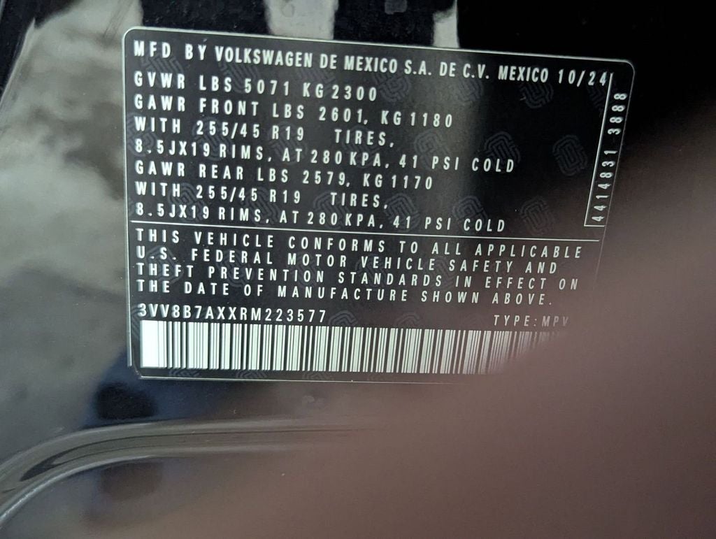 Check out all of the features on this 2024 Volkswagen Tiguan Wheels: 19 Black Painted Twin 5-Spoke Alloy, 3.33 Axle Ratio, 4-Wheel Disc Brakes, 4-Wheel Independent Suspension, 6 Speakers, ABS brakes, Air Conditioning, AM/FM radio: SiriusXM with 360L, Auto-dimming Rear-View mirror, Automatic temperature control, Brake assist, Bumpers: body-color, Compass, Delay-off headlights, Driver door bin, Driver vanity mirror, Dual front impact airbags, Dual front side impact airbags, Electronic Stability Control, Emergency communication system: VW Car-Net Safe & Secure 5-year, Exterior Parking Camera Rear, Four wheel independent suspension, Front anti-roll bar, Front Bucket Seats, Front Center Armrest, Front dual zone A/C, Front reading lights, Fully automatic headlights, Heated door mirrors, Heated Front Seats, Heated front seats, Illuminated entry, Leather Shift Knob, Leather steering wheel, Low tire pressure warning, Occupant sensing airbag, Outside temperature display, Overhead airbag, Overhead console, Panic alarm, Passenger door bin, Passenger vanity mirror, Perforated V-Tex Leatherette Seating Surfaces, Power door mirrors, Power driver seat, Power Liftgate, Power moonroof, Power steering, Power windows, Radio data system, Radio: MIB3 Composition Media AM/FM/HD, Rain sensing wipers, Rear anti-roll bar, Rear reading lights, Rear seat center armrest, Rear window defroster, Rear window wiper, Remote keyless entry, Security system, Speed control, Speed-sensing steering, Split folding rear seat, Spoiler, Sport steering wheel, Steering wheel mounted audio controls, Tachometer, Telescoping steering wheel, Tilt steering wheel, Traction control, Trip computer, Turn signal indicator mirrors, and Variably intermittent wipers.
